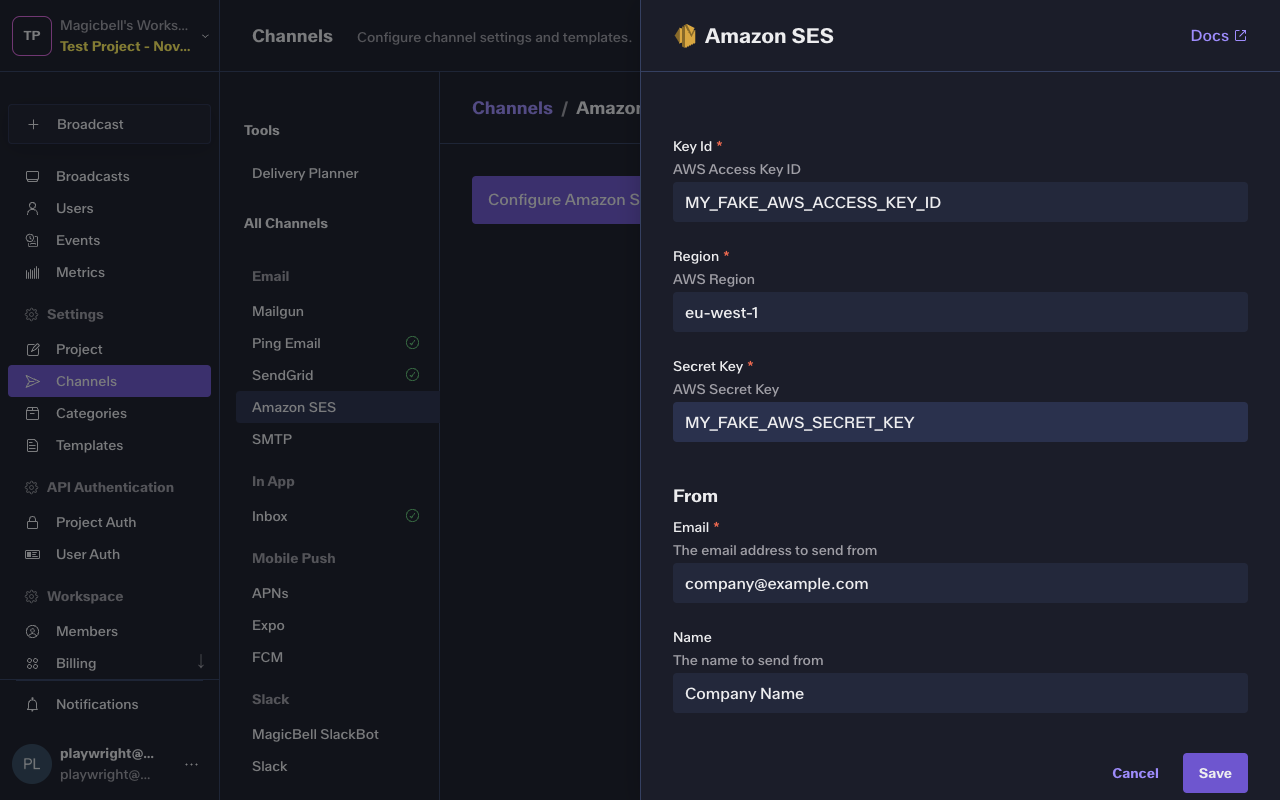 --data '{"key_id":"MY_FAKE_AWS_ACCESS_KEY_ID","secret_key":"MY_FAKE_AWS_SECRET_KEY","region":"eu-west-1","from":{"name":"Company Name","email":"company@example.com"}}'