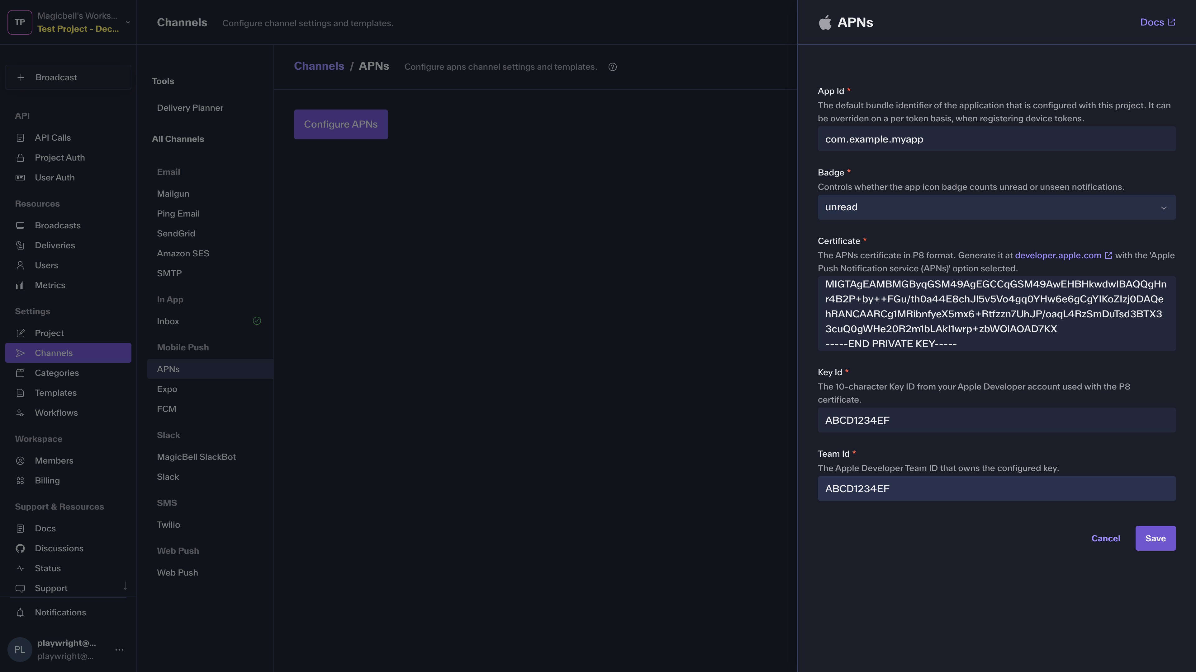 | certificate | string * | The APNs certificate in P8 format. Generate it at developer.apple.com with the 'Apple Push Notification service (APNs)' option selected. |
