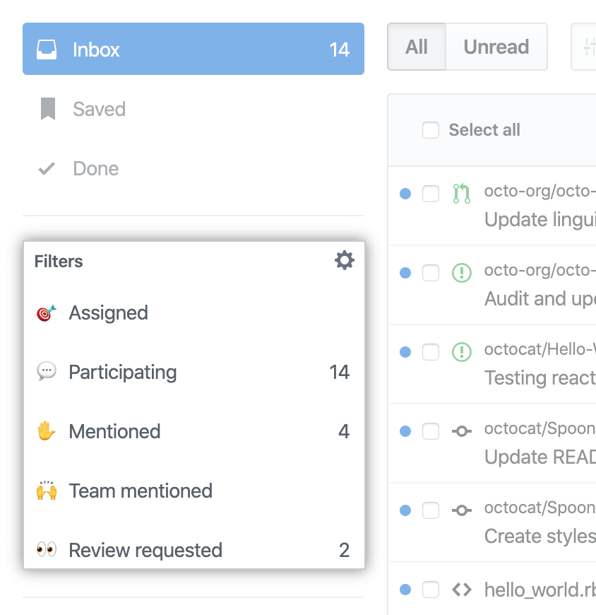 Filters and groups let users sort alerts fast. GitHub has strong inbox filters to help users manage their feed. The default filters cover task assignments, thread activity, review requests, and @tags.