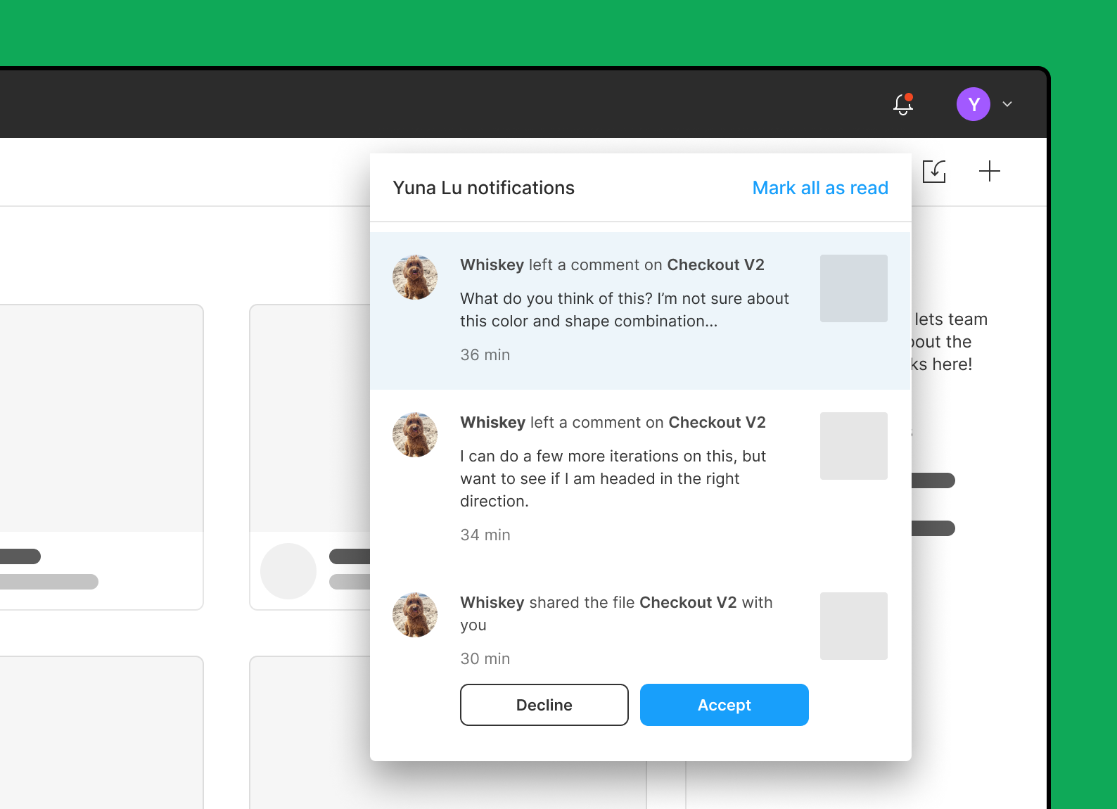 Alerts are at the core of Figma. They keep users in the loop about changes to design files. Figma uses three main channels: email, Slack, and an in-app panel.