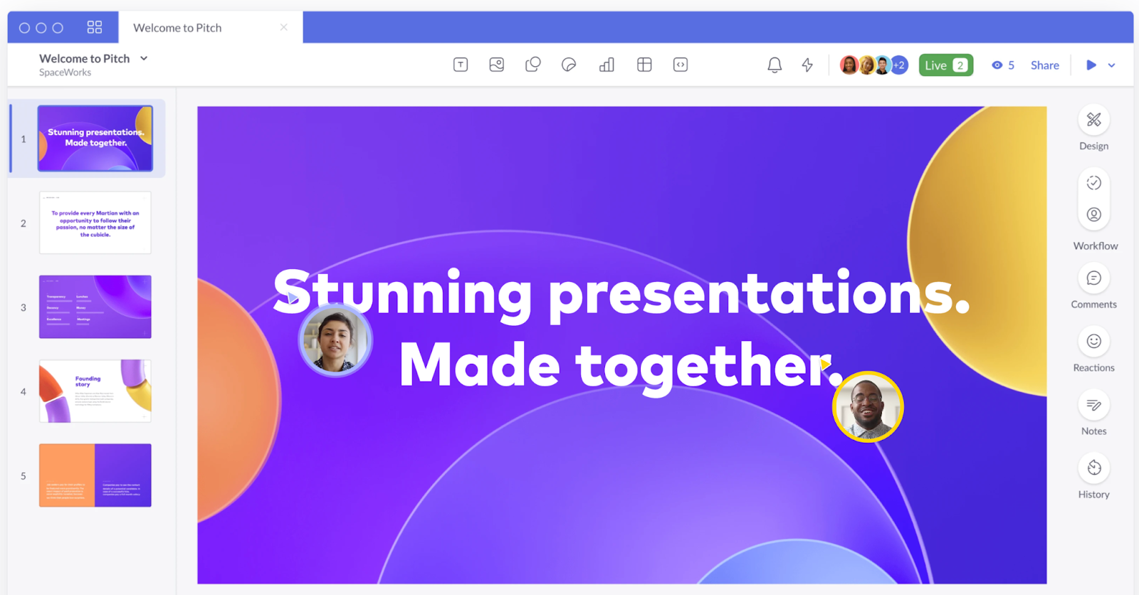 Pitch is a slide tool built for real-time teamwork. It offers smart workflows and simple design tools. Pitch makes it fast and easy for teams to build and share great slides.