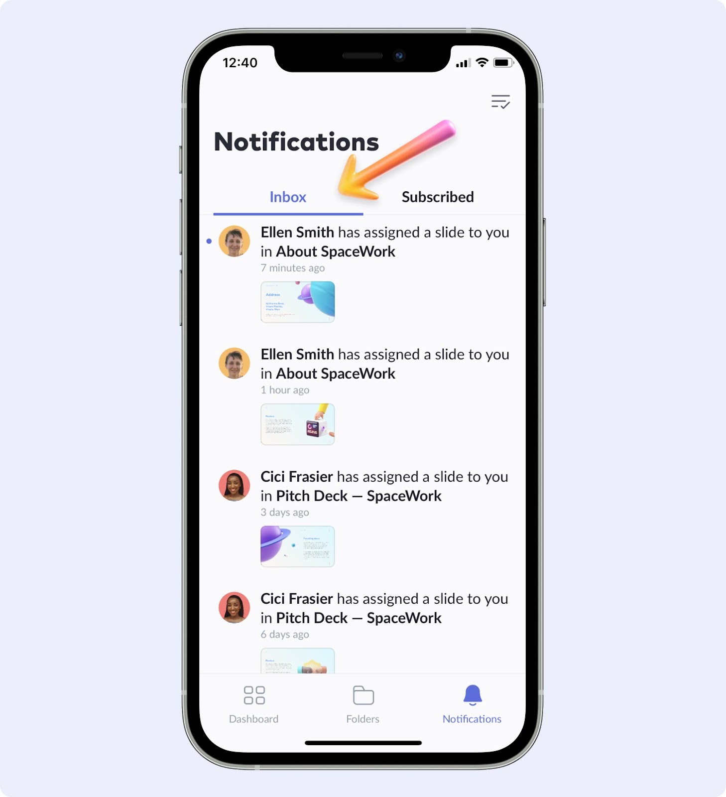 The in-app inbox gives users a fast view of all changes. Pitch has an inbox that shows the latest updates for each user. Users don't need to dig through email. They just open Pitch and click the bell icon. A red badge on the bell shows items that need their focus.