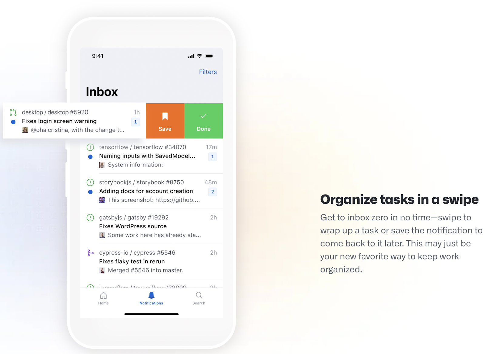 Cross-device alerts keep users up to date. Users can check alerts in the web inbox, the GitHub Mobile app, or email. They can also use all three at once.