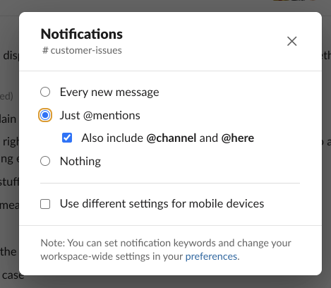 Before we go on any further, let us talk about Slack's ability to set a different preference for mobile notifications. They allow you to do this globally, as well as per channel. It looks something like this: