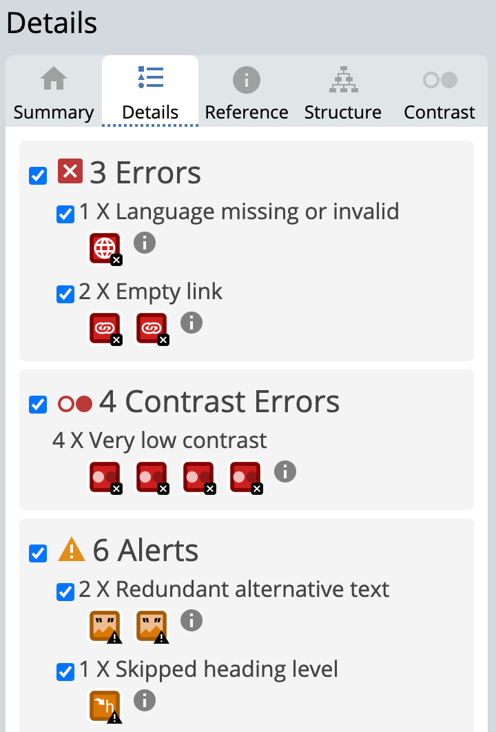 - WAVE (Web Accessibility Evaluation Tool): Check an url to get an evaluation of how well the website is set up for UX accessibility. See where images are missing alt tags or aria labels; check for low contrast.