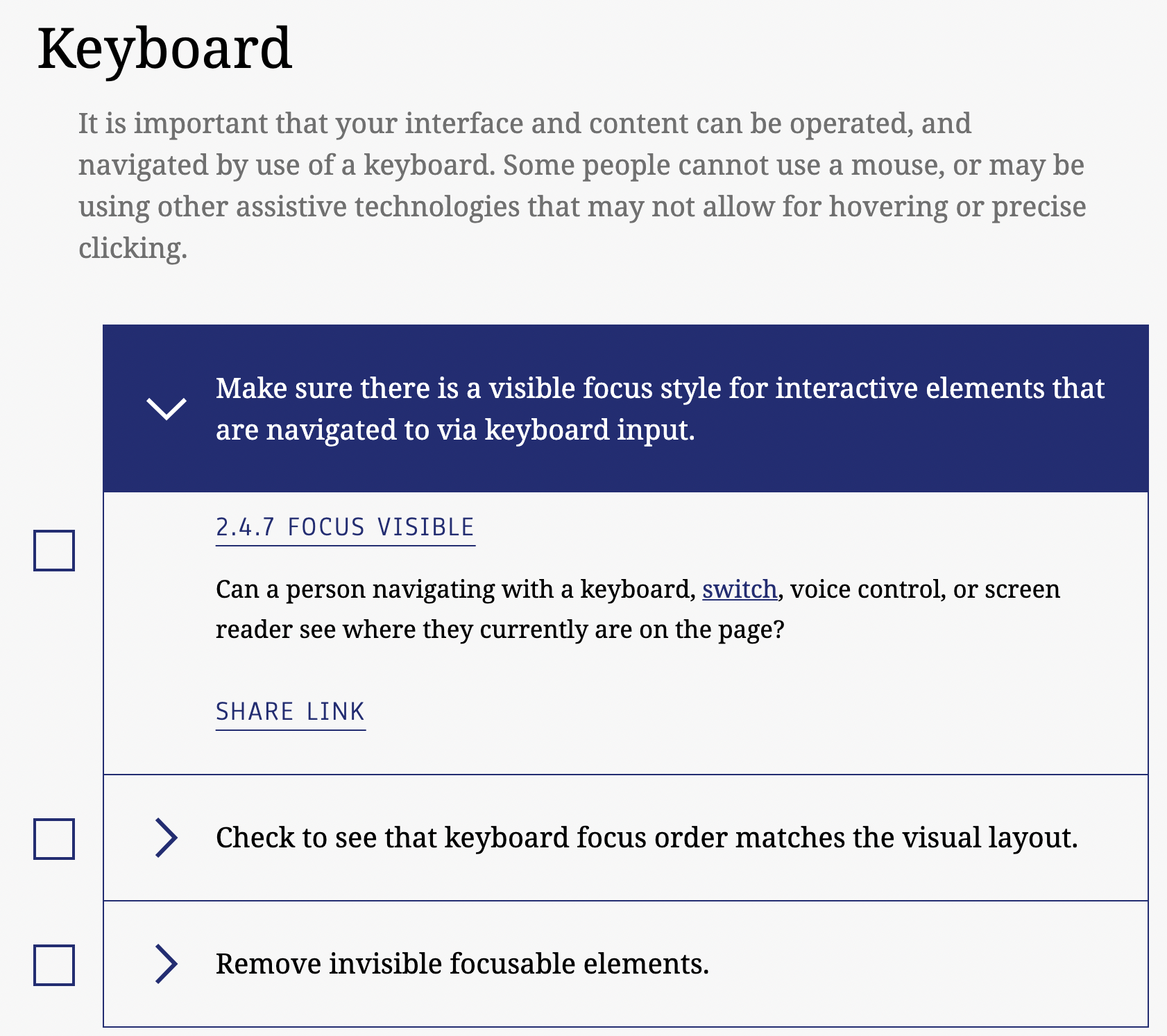 - Surveys and forms also need to have clear focus states for keyboard users.