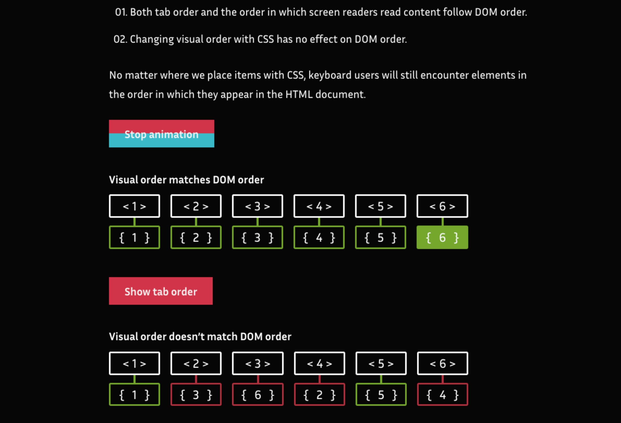 - Three Flashes or Below Threshold: A fairly dense explanation of how to keep animations and content compliant by checking whether or not there are flashes happening more than three times in one second.